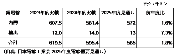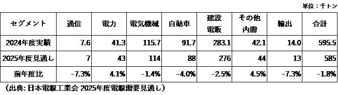 各セグメント別出荷量では、「建設・電販分野」が銅電線出荷量の約50%を占める最大のセグメントで、建築物・住宅・商業施設向けの配線材(低高圧電力ケーブル、制御ケーブル)がこの分野となります。設備投資、都市再開発、物流倉庫関連など、需要は底堅いですが、労働人口の減少や労働環境改善対応、資材高騰などの影響により工事消化に制約があり、前年度比-2.5%予測となっています。