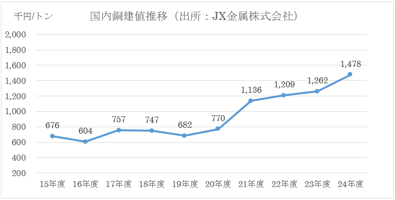 全体として、2021年以降の上昇トレンドが顕著で、2015年度の平均676千円/トンから2024年度は約2倍超に高騰しています。変動性が高く、電線業界ではコスト転嫁や在庫管理が課題となっています。
