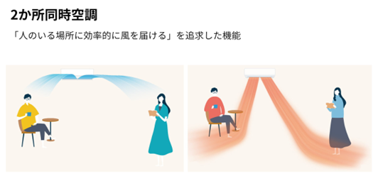 機能充実のハイスペック中堅モデル。プレミアム機能(感情推定)などの一部性能を抑えつつ、ムーブアイ×A.I.自動、自動フィルターお掃除、よごれんボディを搭載しており、コストパフォーマンスに優れています。また、新省エネ基準に対しても、全容量とも達成しており2027年以降も販売継続が見込める商品です。おすすめ機能として、2か所同時空調があります。ムーブアイと連動した気流制御機能で、1台の室内機で部屋の離れた2か所を同時に空調できる技術です。