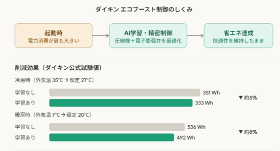 ※ダイキン環境試験室(14畳)、測定機S406ATRPにおいて:学習あり、なしの比較